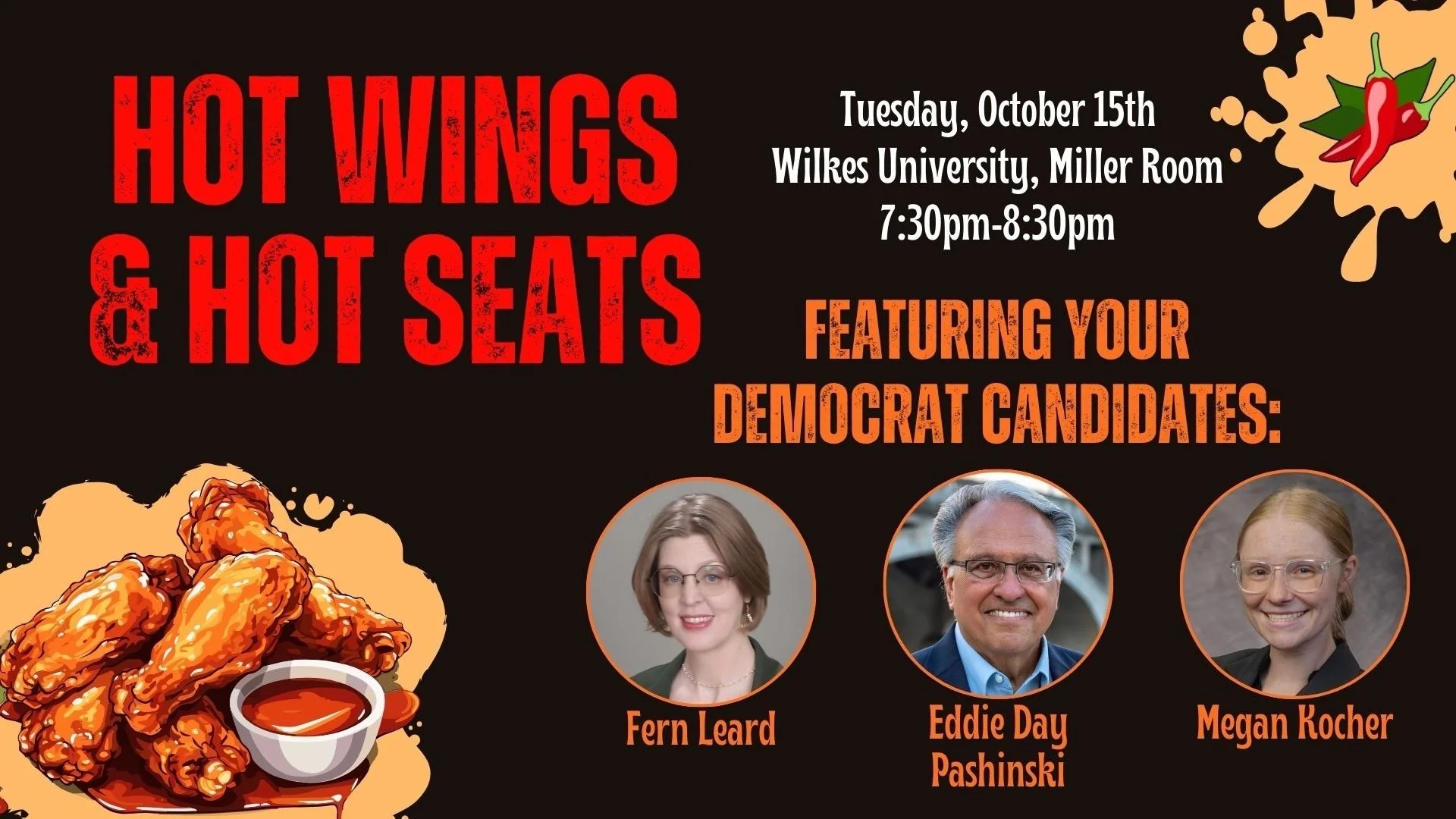 Inspired by Sean Evan’s show “Hot Ones,” I invited Pennsylvania State House candidates Fern Leard, Megan Kocher, and State Representative Eddie Day Pashinski to eat hot wings and take the hot seat. Sophomore and Wilkes University Dems VP John Sudol hosted the event for 30 students to get to know these politicians in a fun and memorable way.